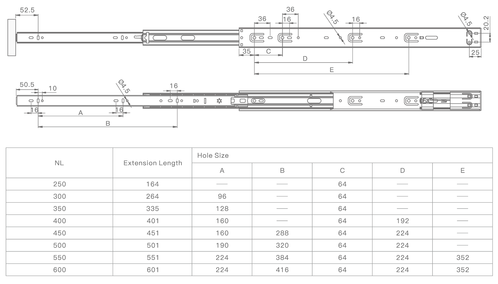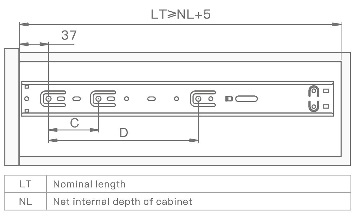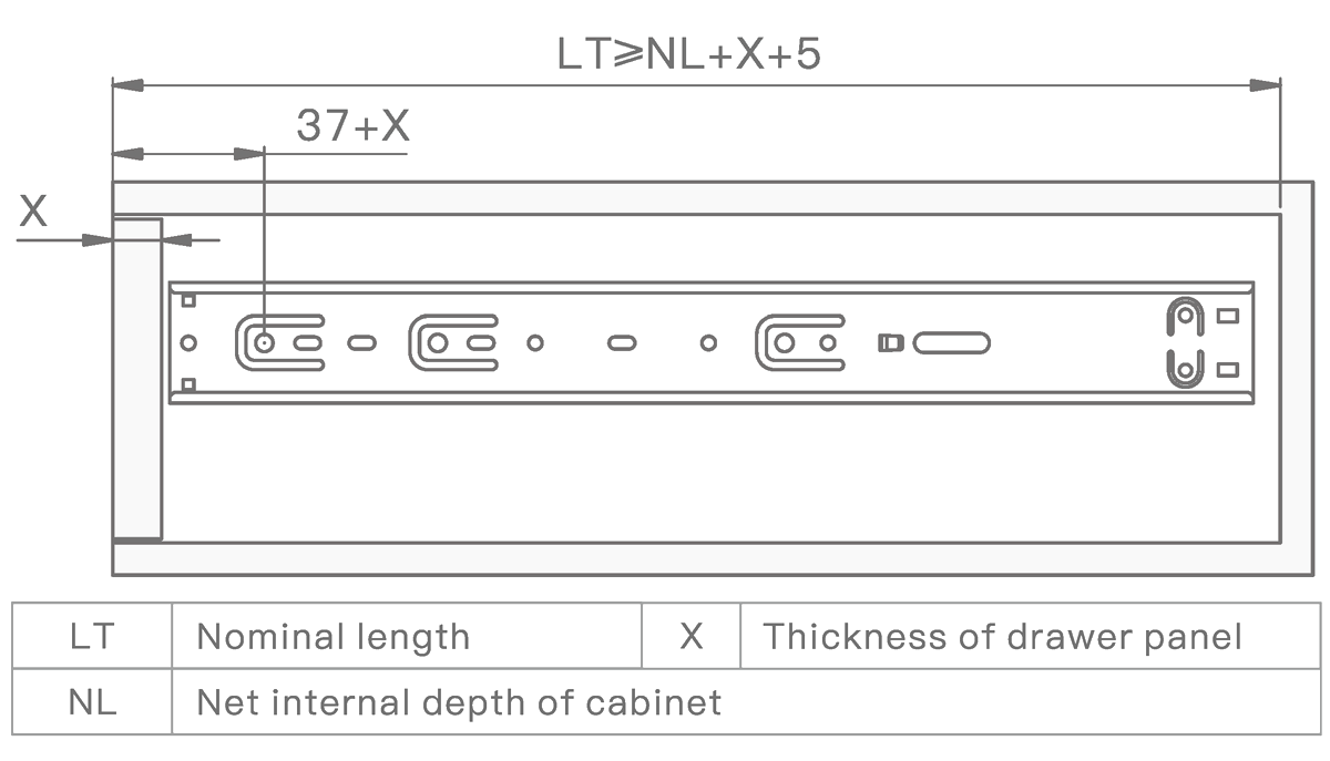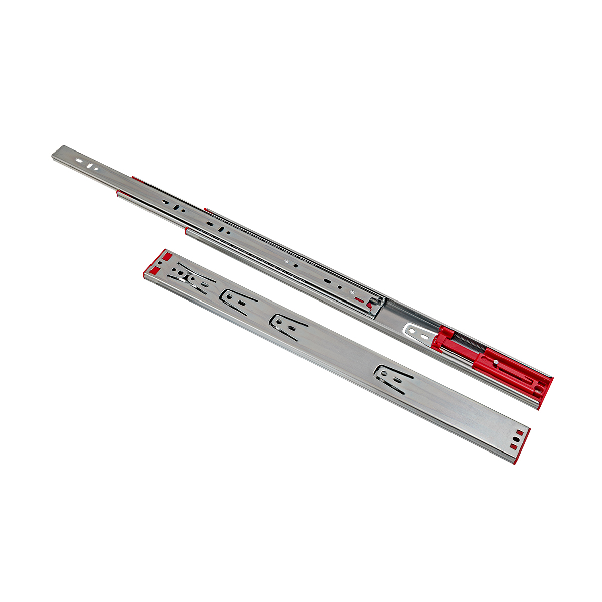 Направляющие в 45-мм высоте оснащены доводчиком двупружинным. Имеет усиленные толщины 1,0/1,0 /1,2 из холоднокатаной стали. Направляющие рассчитаны на постоянную нагрузку в 25 кг со сроком службы 60 000 циклов. Имеют шарикоподшипниковые механизмы и телескопическую структуру, что обеспечивает полное выдвижение ящика. Функция сброса и бесшумного самодоката